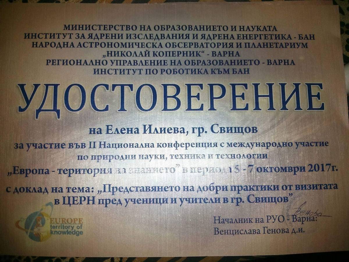 В периода от 5 до 7 октомври 2017 г., в гр. Варна се проведе II национална конференция с международно участие по природни науки, техника и технологии „Европа – територия на знанието”. Конференцията беше под патронажа на министъра на образованието и науката Красимир Вълчев и организирана по национална програма „Квалификация“, в партньорство с Института за ядрени изследвания и ядрена енергетика към БАН. Участие в нея взеха и представители на образователния офис на ЦЕРН – Швейцария, както и на други университети в страната.