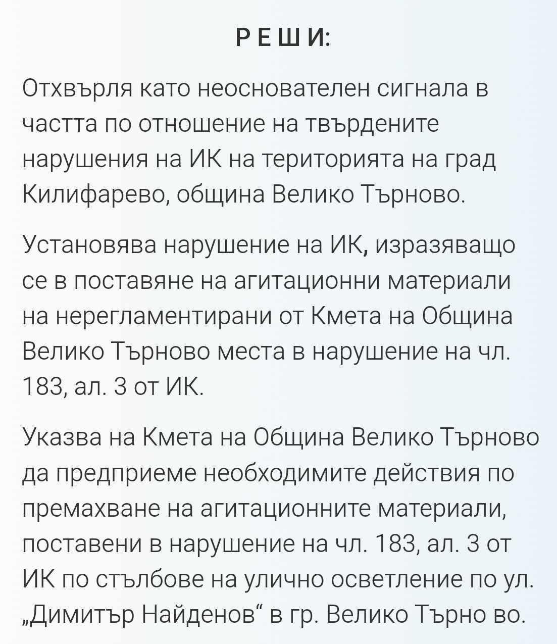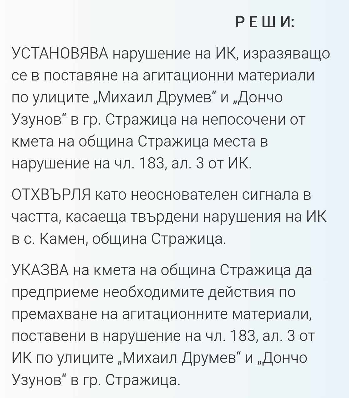 По два сигнала на „Възраждане“ Районната избирателна комисия излезе с решения за премахване на плакати от централните улици на Стражица и от кв. „Света гора“ във Велико Търново, поставени в нарушение на Изборния кодекс и кметските разпореждания. В тях се указва на кметовете на двете общини да предприемат необходимите действия по премахване на агитационните материали на Движението за права и свободи. Това са и единствените два сигнала или жалби, подадени до момента към РИК. Никой друг, освен „Възраждане“ все още не ги е сезирал за проблем в изборния процес.