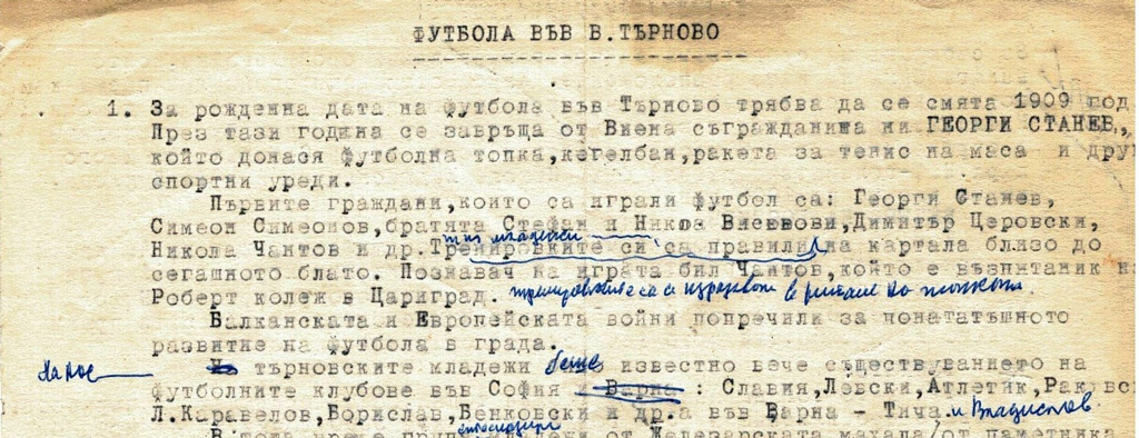 “Футбола във В. Търново” е озаглавил записките си бай Кольо, собственоръчно отпечатани на пишещата му машина. Върху пожълтелите листи сам на ръка нанася корекции. “За рождена дата на футбола във В. Търново трябва да се смята 1909 г. През тази година от Виена се завръща съгражданинът ни Георги Станев, който донася футболна топка, кегелбан, ракета за тенис на маса и други спортни уреди. Първите граждани, които са играли футбол, са Георги Станев, Симеон Симеонов, братята Стефан и Николай Високови, Димитър Церовски, Никола Чантов и др. Тренировките са си правили (тия младежи) на Картала, близо до сегашното блато. Познавач на играта бил Чантов, който е възпитаник на Роберт колеж в Цариград. (Тренировките са се изразявали в ритане на топката – добавя на ръка Никола Илиев). Балканската и Европейската война попречили за по-нататъшното развитие на футбола в града”…