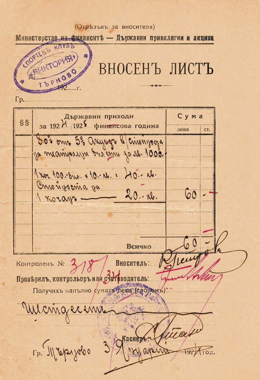 Футболистите на “Виктория” печелят мачовете си наред! А в края на годината организират Коледна вечеринка. На входните билети задължително има гербова марка от 1 лев. Сто билета по 10 лв. са продадени и в касата влизат 1000 лева, за които съвестно даже си плащат данъка на държавата. На разписката ясно се вижда датата – 3 януари 1924 г., както и печатът на СК “Виктория” (Търново).