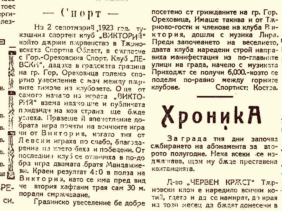 От старите вестници изплува и репортаж за друг техен мач – победата им с 4:0 над горнооряховци като гости. Двубоят се играе на 2 септември 1923 г., като “Виктория” не само още съществува, но е и първенец на Търновската спортна област! След мача двата отбора правят манифестация из Горна Оряховица, а после дават и градинско увеселение, от което събират 6000 лв. Тогавашният търновски вестник “Ново време” с подробности отразява събитието: “Тукашният спортен клуб “Виктория”, който държи първенство в Търновската спортна област, в съгласие с горнооряховския СК “Левски” дадоха в градската градина на Г. Оряховица голямо спортно увеселение с мач между първите отбори на клубовете.