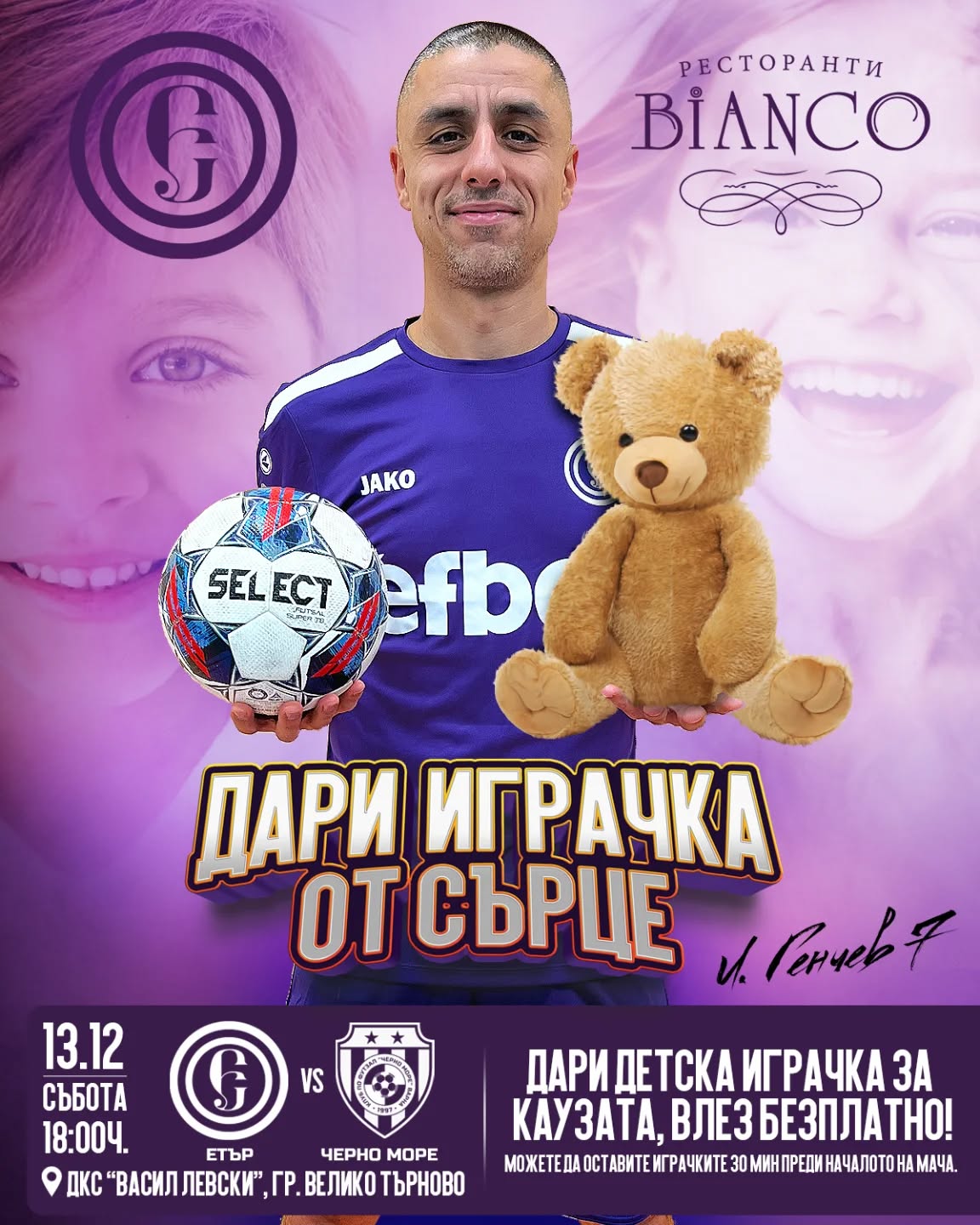 В събота от 18:00 ч. в ДКС “Васил Левски” по време на мача с „Черно море“ организираме специална благотворителна акция: „Донеси играчка – влез безплатно на мача!“ Всички събрани подаръци ще бъдат дарени на децата в социалните услуги на Община Велико Търново. Заедно с нашите партньори Ресторанти Bianco вярваме, че можем да напълним залата… и да я напълним с добрина. Болярите помагат! Всички заедно! Ела на 13 декември, донеси играчка и стани част от нашата коледна кауза. Подари усмивка, подари надежда!“, обявиха от Футзал клуб „Етър“.