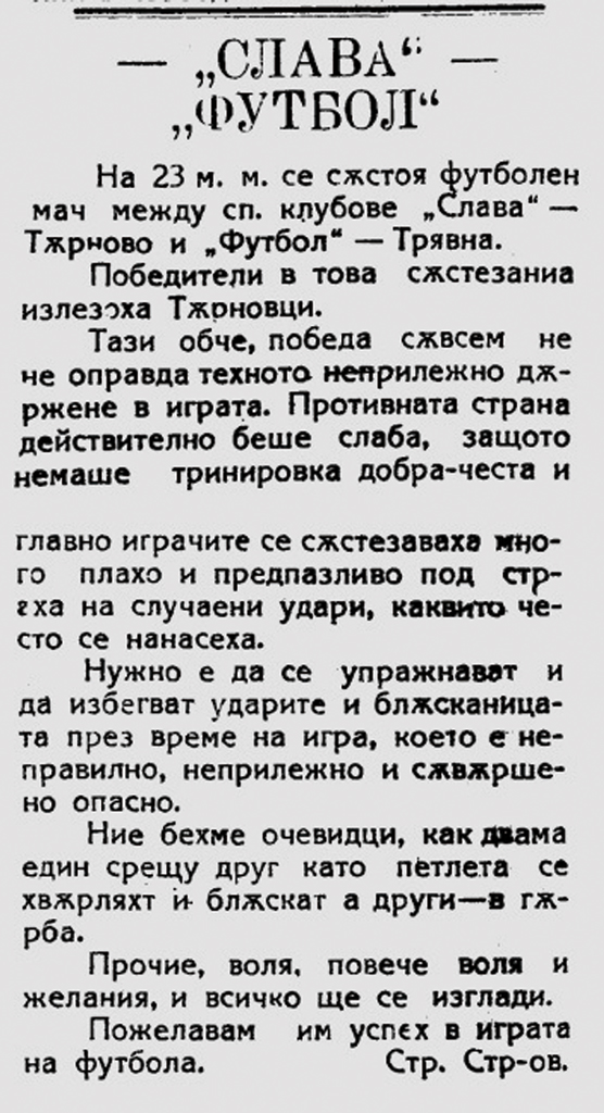 В архивите на търновските вестници отпреди век открихме и една от първите спортни дописки – за мач именно на СК “Слава” срещу “Футбол” (Трявна), игран на 23 септември 1923 г. Материалът е публикуван във в. “Ново време”. “Победители в това състезание излязоха търновци. Тази обаче победа съвсем не оправдава тяхното неприлежно държание в играта. Противната страна действително беше слаба, защото нямаше тренировка добра, играчите се състезаваха много плахо и предпазливо под страха на случайни удари, каквито често се нанасяха. Нужно е да се упражняват и да избягват ударите и блъсканицата през време на игра, което е неправилно, неприлежно и съвършено опасно. Ние бяхме очевидци как двама един срещу друг като петлета се хвърлят и блъскат, а други – в гърба. Прочие, воля, повече воля и желание и всичко ще се изглади. Пожелавам им успех в играта на футбола”, пише в текста, подписан от някой си Стр. Стр-ов.