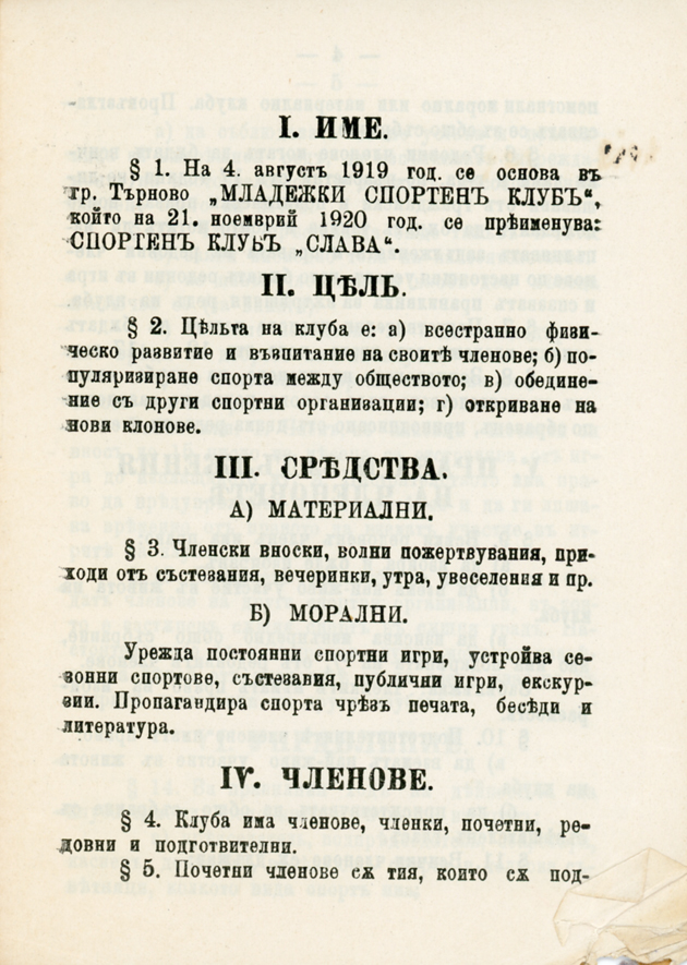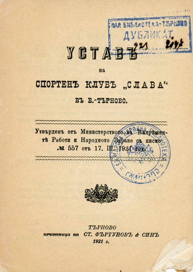 Бай Колю леко бърка датата, тъй като “Слава” е учреден още на 21 ноември 1920 г. Това става ясно от запазения в РНБ “Петко Славейков” Устав на СК “Слава”, в който на първа страница е записано: “На 4 август 1919 г. се основа в гр. Търново “Младежки спортен клуб”, който на 21 ноемврий 1920 г. се преименува Спортен клуб “Слава”.