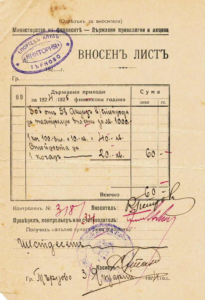 Футболистите на “Виктория” печелят мачовете си наред! А в края на годината организират Коледна вечеринка. На входните билети задължително има гербова малка от 1 лев. Сто билета по 10 лв. са продадени и в касата влизат 1000 лева, за които съвестно даже си плащат данъка на държавата. На разписката ясно се вижда датата – 3 януари 1924 г., както и печатът на Спортен клуб “Виктория” (Търново).