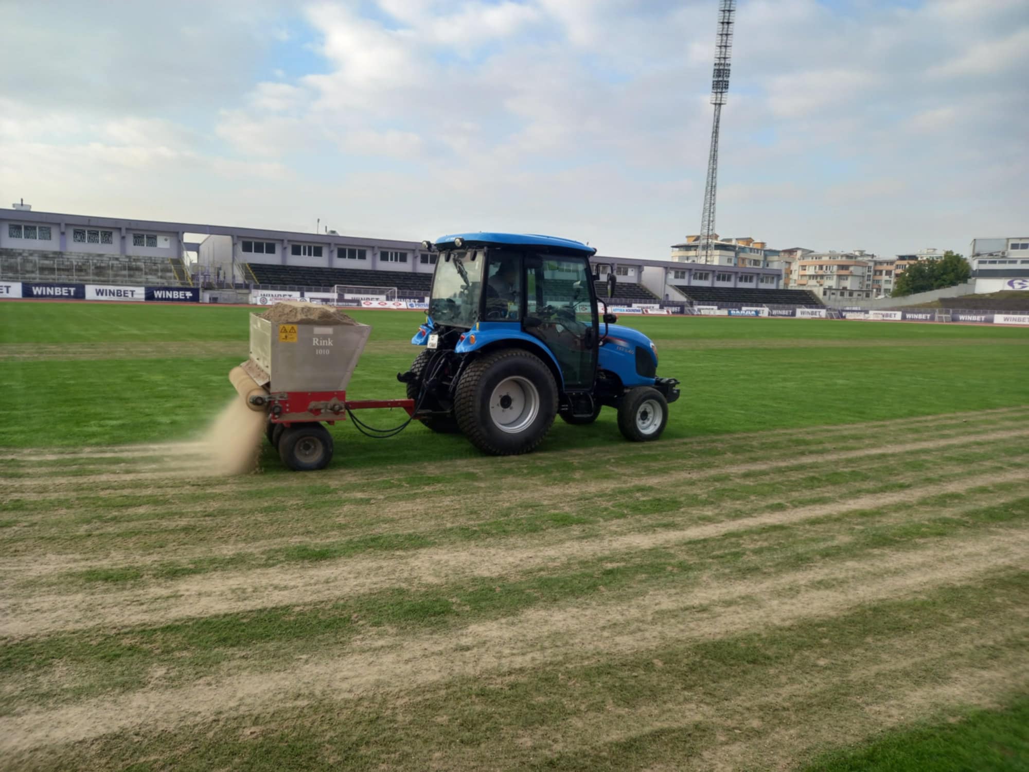 Междувременно теренът на стадион „Ивайло“ бе обработен със специализирана техника. Тревното покритие бе аерирано дълбоко, като целта е да се направят отвори в горния слой, които да преодолеят кореновата зона и да достигнат до дренажа. След това теренът бе опесъчен, за да може да отворите да се запълнят с пясък и да се подобри оттока на водата от горния слой. По този начин в чима не се задържа вода и няма гниене на тревата. Аерирането помага  още за подобряване циркулирането на въздуха, водата и хранителните вещества в кореновата система. Това от своя страна позволява на корените да се развиват по-дълбоко, създавайки по- здрави тревисти растения. Освен това пясъкът стяга горния слой и теренът поема по-леко натоварванията, като съответно предлага по-добри условия за игра.