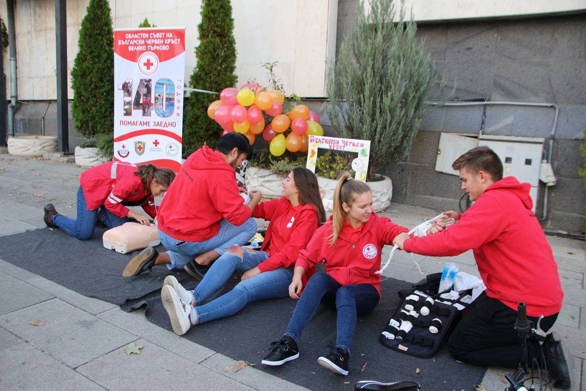 Младежи от БМЧК демонстрираха във В. Търново как се оказва първа долекарска помощ. Пред сградата на Общината доброволците показаха обработване на рана и как се прави изкуствено дишане. В същото време раздаваха на минувачите магнити и информационни брошури за дейността на Областния съвет на БЧК. Инициативата си червенокръстците посветиха на 140-годишнината от основаването на БЧК в България.