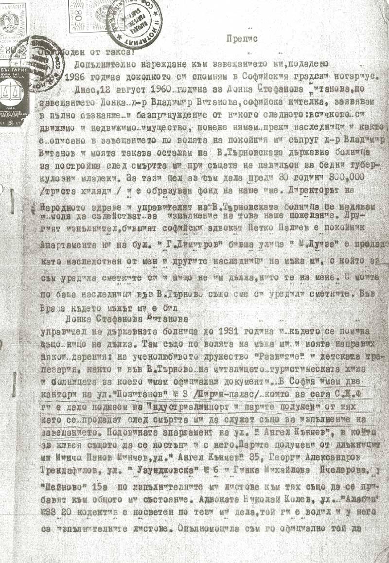 Той учредява дарителски фонд от 300 000 лв., като 200 000 лв. от тях дарява на държавната болница, останалите разпределя на читалище “Надежда” и ТД “Трапезица” във Велико Търново, а също на дружество “Развитие” във Враца. Тъй като двете деца на семейството си отиват от този свят заради туберкулоза, през 1936 г. Донка и Владимир решават да завещаят всичкото си имущество на Велико Търново, където да се лекуват онези, които имат сходен проблем. Когато умира докторът, завещанието е било регистрирано в Общината в столицата. То е отворено, когато умира и съпругата му Донка към 1970 г., която е направила допълнение към завещанието през 1960 г. От него става ясно, че Витанова оставя всичкото си движимо и недвижимо на великотърновската държавна болница за постройка на павилион за лечение на бедни туберкулозни младежи. На белодробната болница е завещан и апартамент на ул. “Ангел Кънчев” № 35 в столицата, в самия център на града. “В София имам две кантори на ул. “Позитано” № 3, които след смъртта ми да се продадат и да служат също за изпълнение на завещанието”, пише още в допълнението. В него Витанова допълва, че има длъжници и като се вземат парите от тях чрез изпълнителни листи, да се прибавят към общото ѝ благосъстояние. Донка оставя още лични спестявания и влогове в банки, които дарява на белодробната болница. За болните от туберкулоза остава и цялата покъщнина на семейството. Всичко това е описано в протоколи, където се съобщава ненужните вещи да се разпродадат и парите да се предоставят на тубдиспансера.